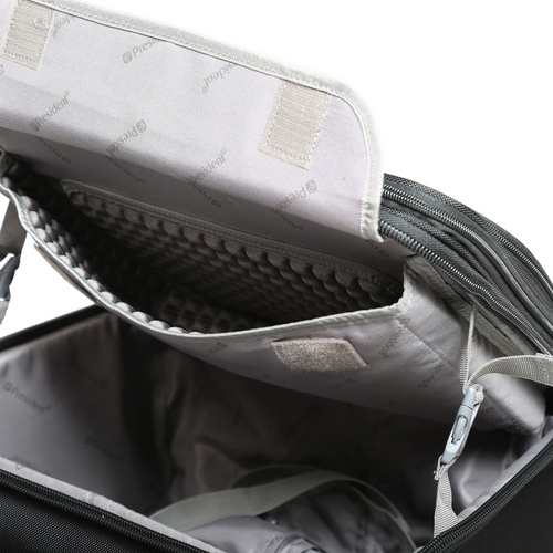 زیپ اصلی این محصول نمره ده دوبل می باشد و دارای قفل رمزی TSA می باشد. چمدان خلبانی 16 اینچی مدل 6149TC پرزیدنت | President طراحی داخلی این محصول بسیار شیک از آستر پلی استر با طرح پرزیدنت می باشد و در قسمت درب آن یک فضای جای لپ تاپ حباب دار مناسب سایز 13 تا 14 اینچ وجود دارد و در کناره ها در هر طرف یک بند وجود دارد که توسط سگک باز و بسته می شود که قسمت درب فضای اصلی زمانی که بندها بسته باشد مانع از رسیدن درب به زمین می شود.